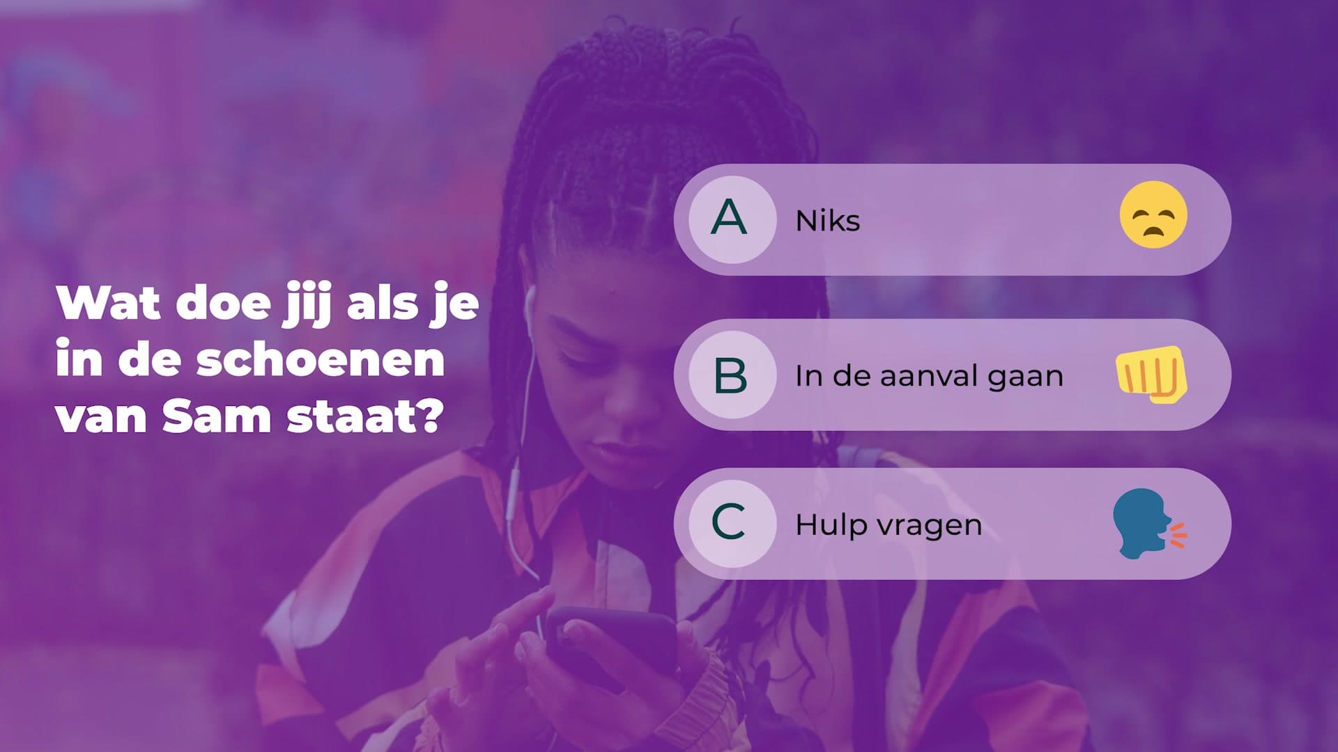 In Act or React, zoals de campagne heet, hebben wij online situaties uit het dagelijks leven van middelbare scholieren nagebootst. Kijkers kunnen daarbij kiezen voor verschillende ‘manieren van reageren’, zodat zij, wanneer ze zelf een keer in zo’n situatie terecht komen, beter weten hoe ze ermee om moeten gaan.